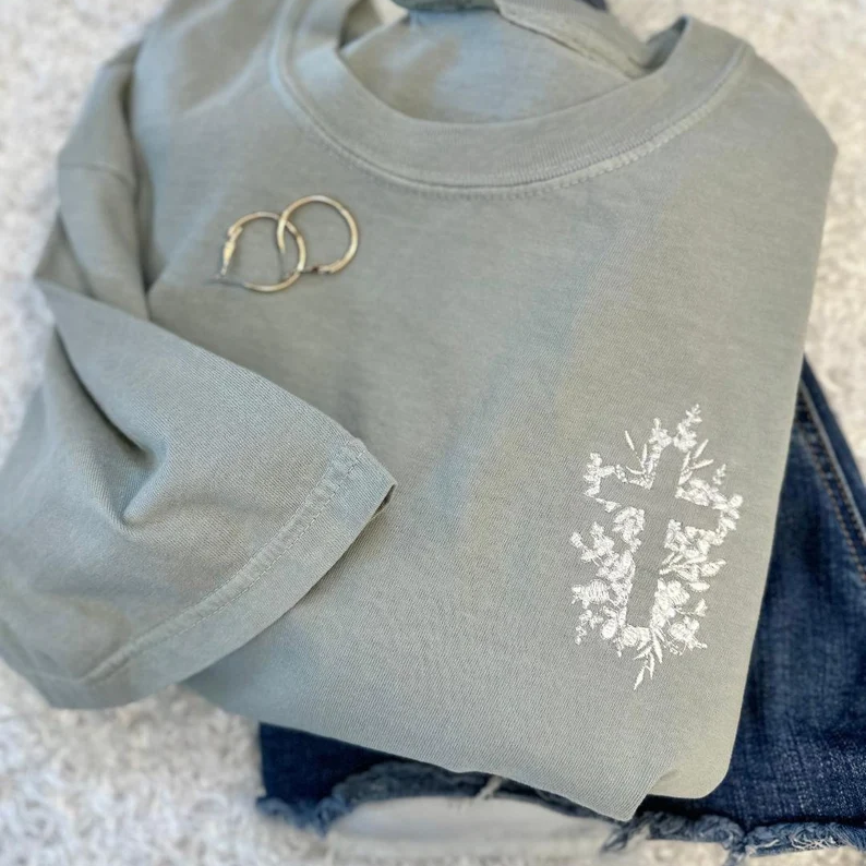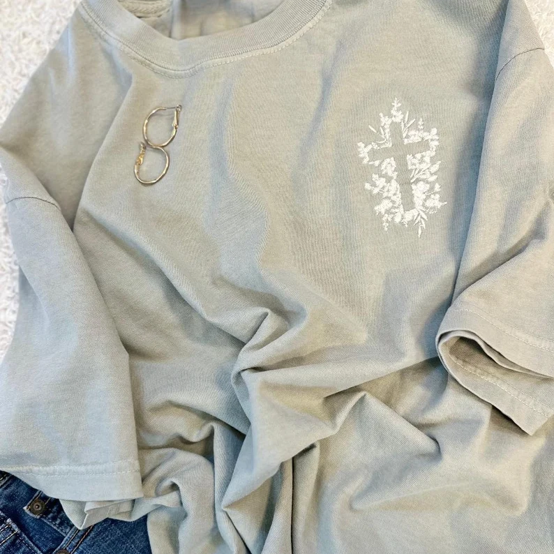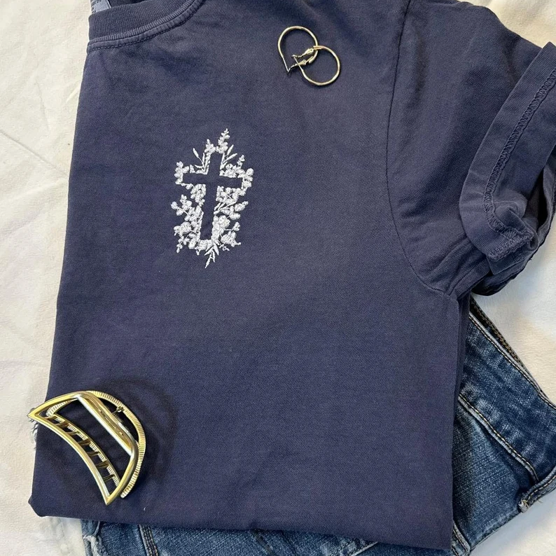 Hollow Cross Embroidery Unisex Heavy Cotton T-Shirt