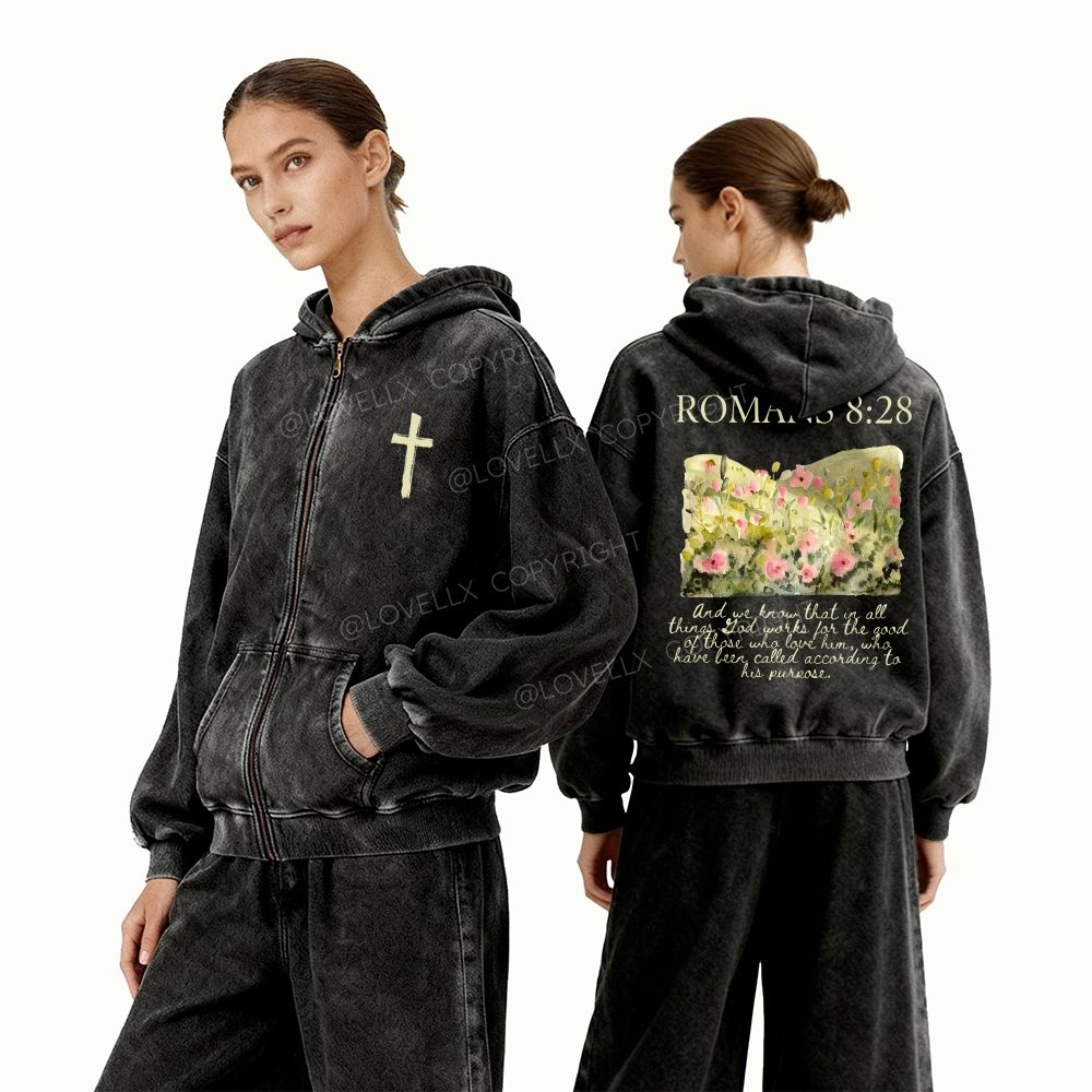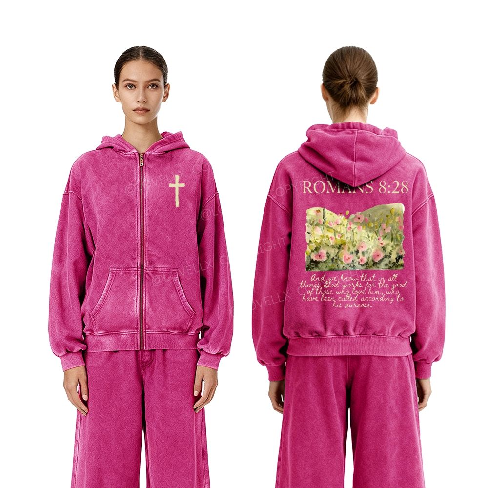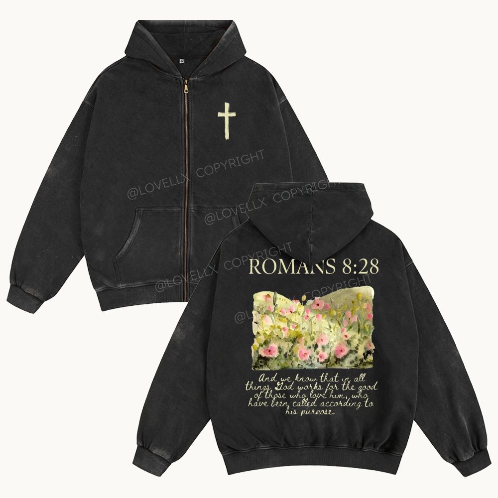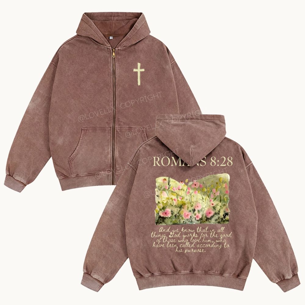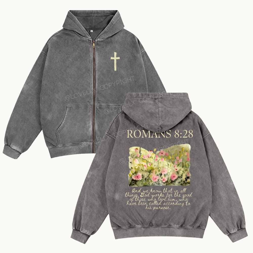 Romans 8:28 Unisex Washed Zip-Up Hoodie